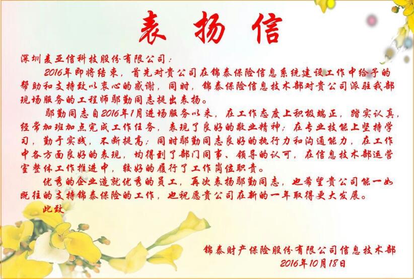 近日,深圳麥亞信科技股份有限公司(以下簡稱“麥亞信”)收到一封來自錦泰財產保險股份有限公司(以下簡稱“錦泰財險”)的表揚信,信中對麥亞信技術人員鄢勤先生提出了高度的表揚。鄢勤先生在錦泰財險信息系統建設項目的實施過程中,表現出專業的技術能力和優異的執行力,得到了客戶的一致好評。